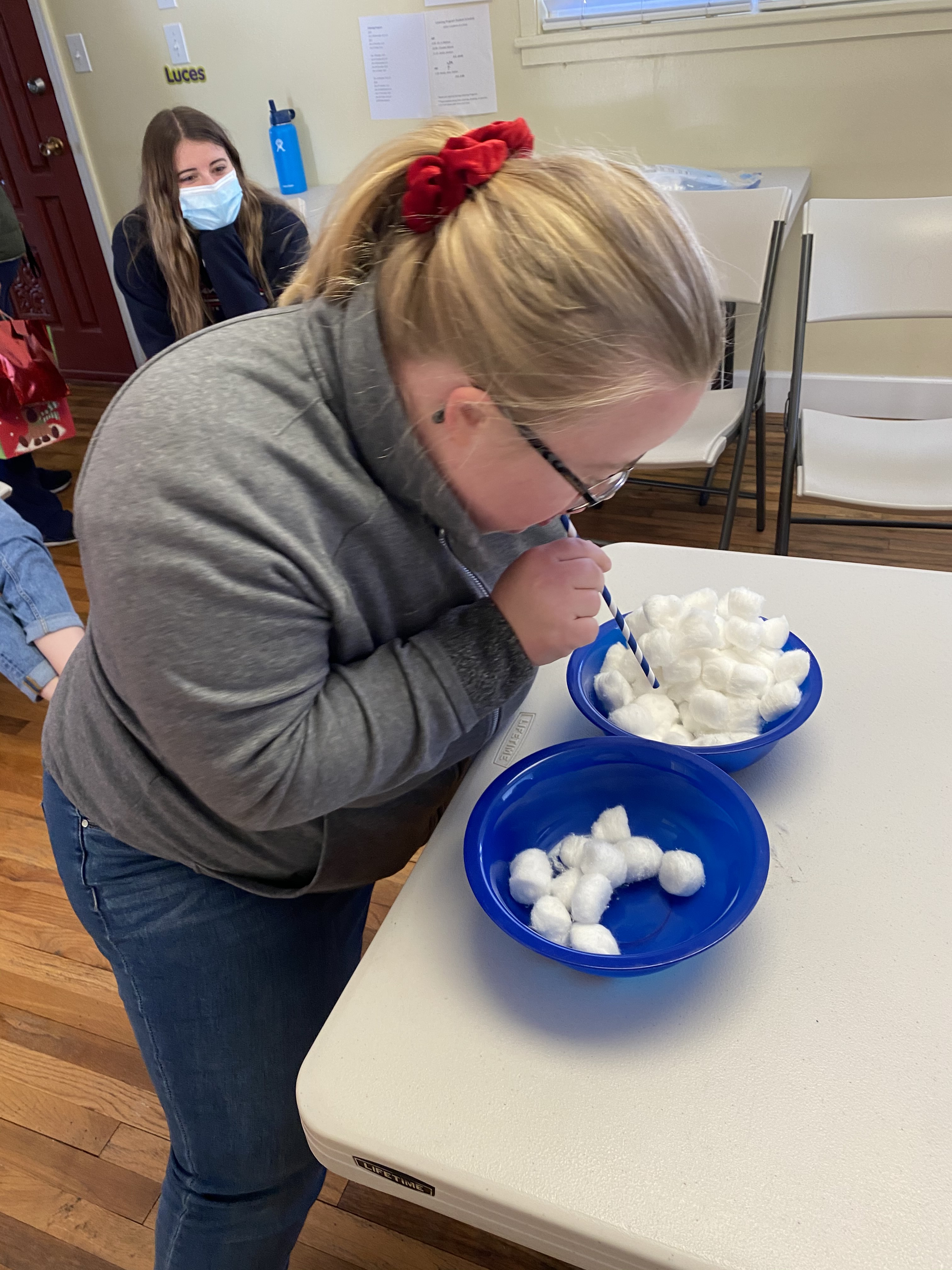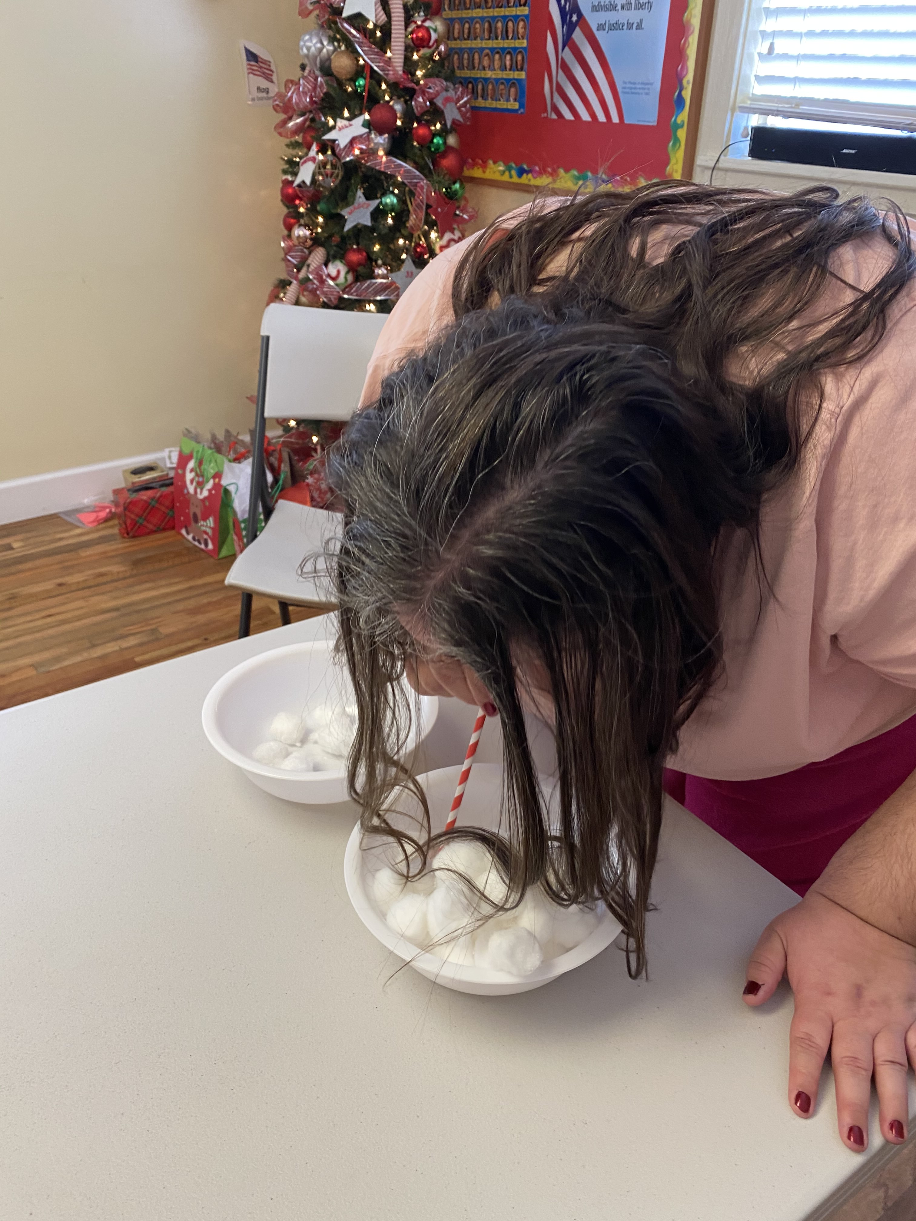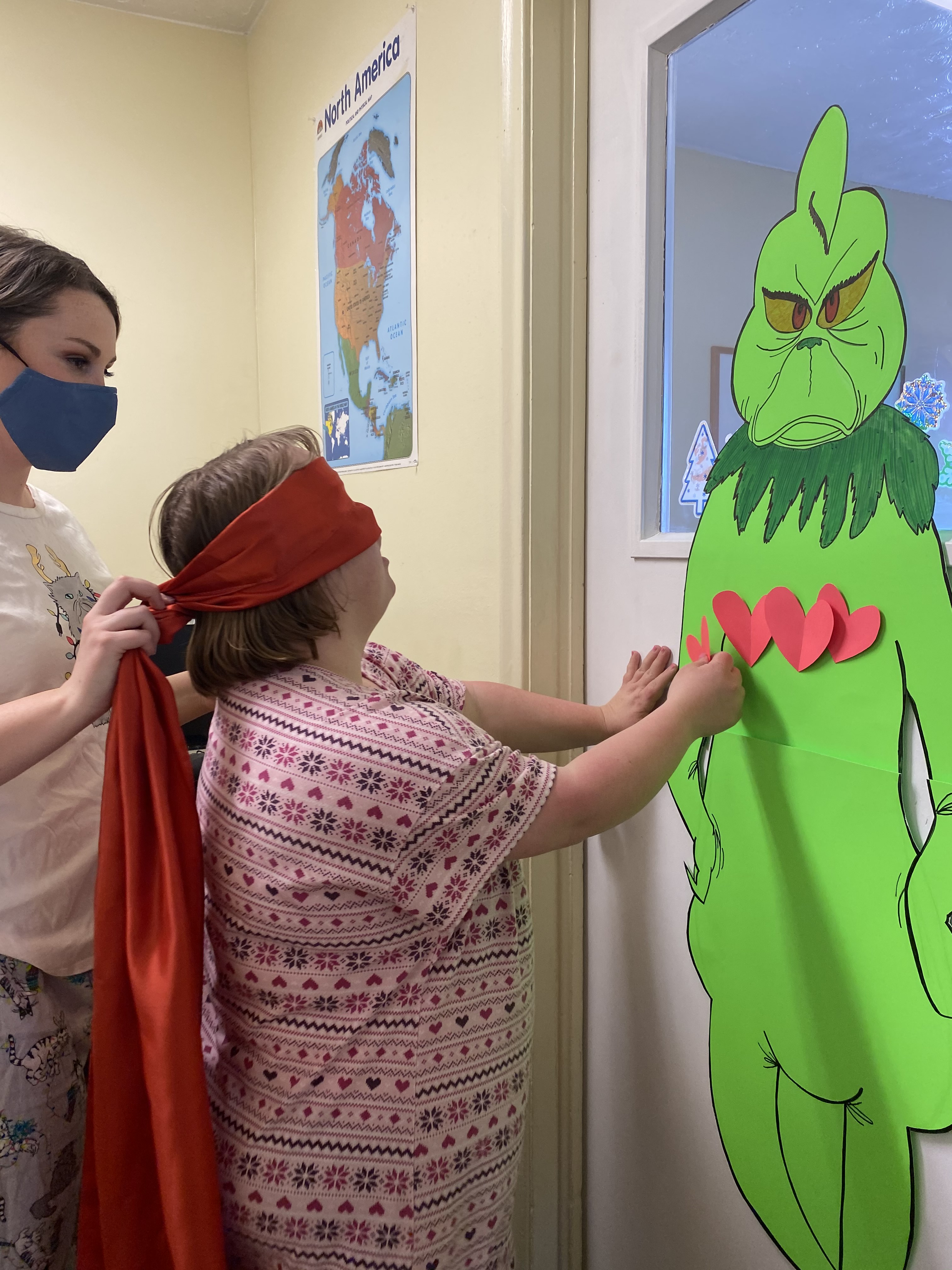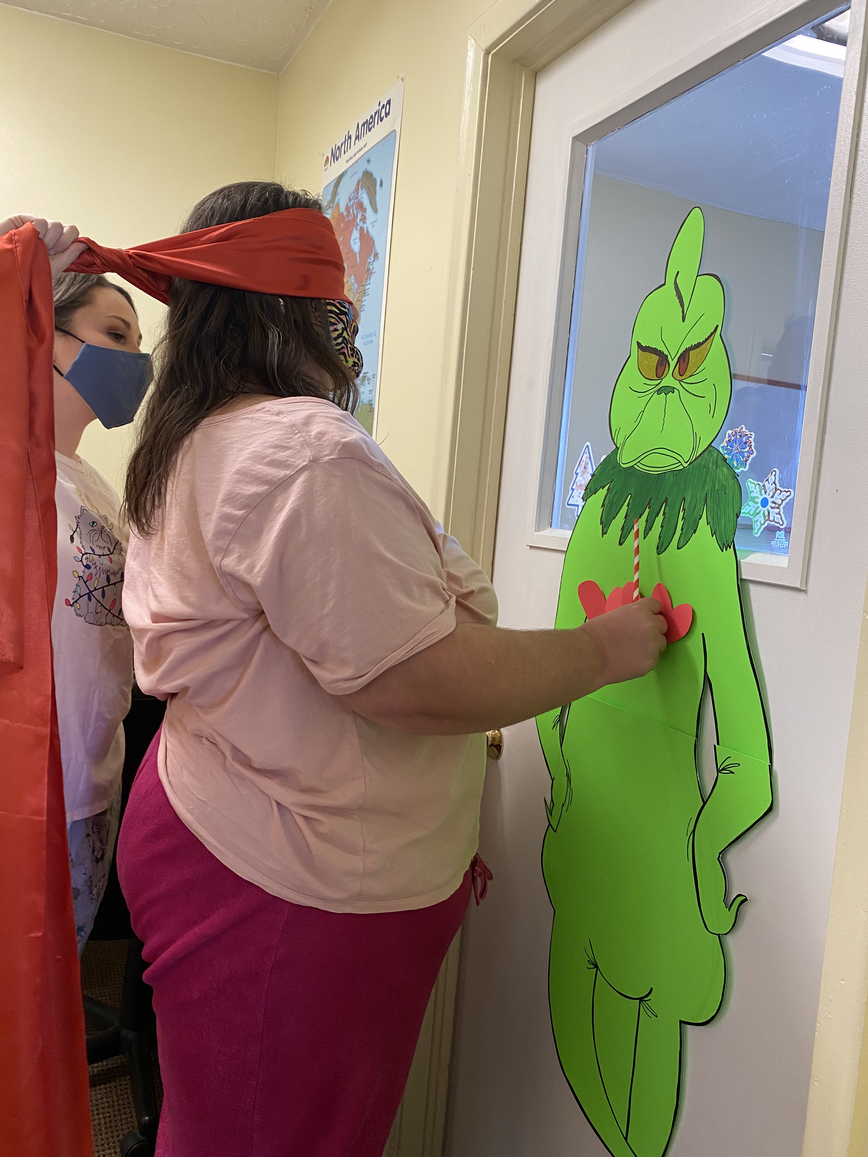 After exchanging gifts, it was time to really get the party started with some fun games! The students did the “Santa Shake” freeze dance (they had a Kleenex box filled with Christmas ornaments tied around their waist that they had jump up and down and shake all around to get them out; if the music stopped they had to freeze), a “Snowball Shovel” (they had a straw that they had to suck up the cotton balls and move them from one bowl to another), a “Santa Says” (like Simon says, but Christmas edition), and a pin the heart on the Grinch. To top off our wonderful day of fun, we enjoyed a delicious lunch of whole wheat pancakes topped with a strawberry Santa hat, turkey bacon, and hot, steaming Wassel. While we ate we had the pleasure of listening to Cindy and Diana Wade play Christmas music on the violin and piano!